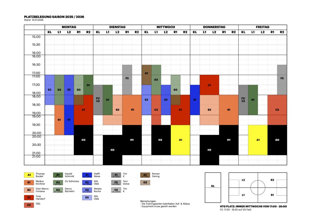 Die einzelnen Trainingszeiten findest Du detailliert bei den jeweiligen Mannschaften aufgeführt. Grundsätzlich beginnt der Trainingsbetrieb täglich um 16:00 bis 16:30 Uhr in geht bis in den Abend hineinen. Die jüngeren Jugendmannschaften sind früher dran und abends trainieren hauptsächlich die Aktiven, also die Herrenmannschaften.